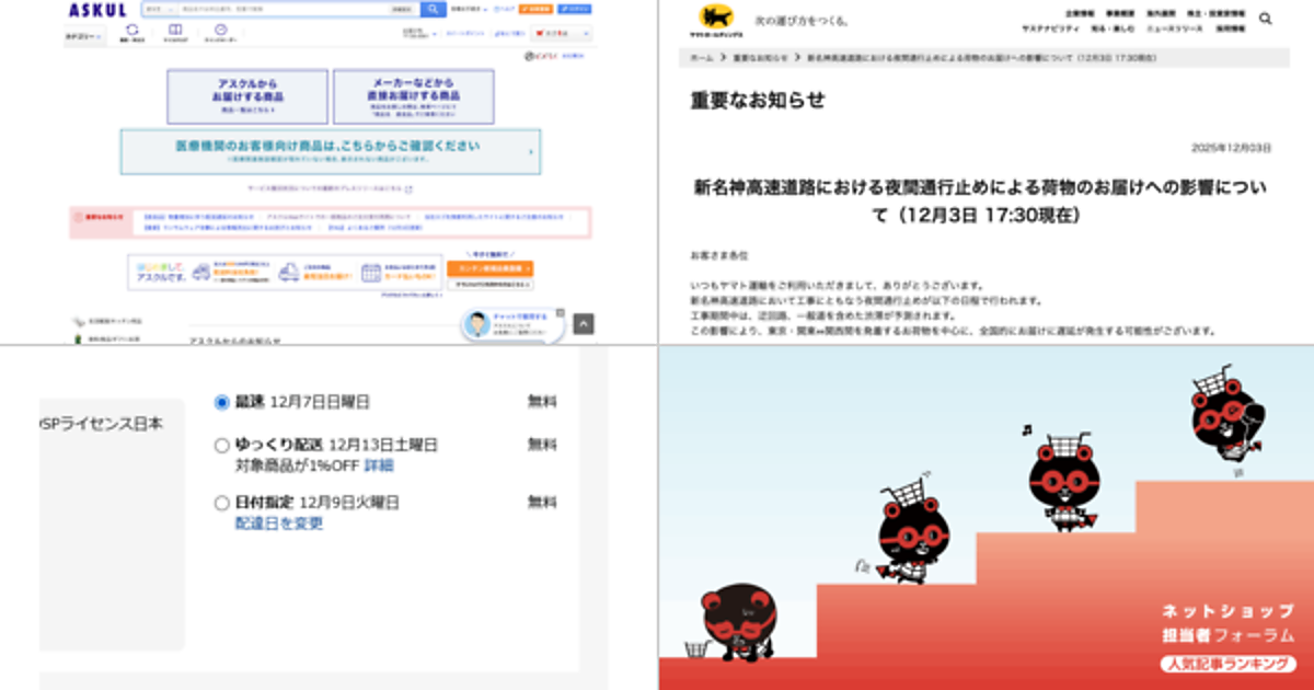 週間人気記事ランキング アスクルが法人向けEC「ASKUL」を再開/ヤマト運輸が東京・関東⇔関西間の発着荷物に遅延発生の可能性【ネッ担アクセスランキング】 2025年12月5日~2025年12月11日にアクセス数の多かった記事のランキングを発表! 見逃している人気記事はありませんか? 藤田遥2025年12月12日 8:00シェアポストはてブBluesky アスクルが法人向けEC「ASKUL」を再開、物流業務は手運用→WMSを使用した在庫商品出荷は12月中旬以降を予定 アスクルは現在、倉庫管理システム(WMS)を利用しない暫定運用で対応しており、WMSを使用した在庫商品の出荷は一部物流センターで12月中旬以降に再開する予定。 鳥栖 剛[執筆] 12月8日 6:00 ヤマト運輸、東京・関東⇔関西間の発着荷物に遅延発生の可能性。12/8以降の新名神高速道路における夜間通行止めの影響 新名神高速道路の甲賀土山IC~草津JCT間(上下線・約32.6km)で工事があり、期間は12月8日(月)夜~12月10日(水)朝と、2025年12月15日(月)夜~12月17日(水)朝。いずれも20時~翌6時(10時間)で夜間通行止めとなる。 鳥栖 剛[執筆] 12月5日 7:30 Amazon、「ゆっくり配送」で対象商品1%引き。12/9まで実施 「ゆっくり配送」を選択すると、配達予定日は最長で注文日から約8日後となる。 鳥栖 剛[執筆] 12月5日 7:00 佐川急便、年末にかけて物量増加で「余裕をもって発送の準備を」と呼びかけ 年末にかけての通販セールや歳末商戦の影響で全国的に荷物の取扱量が大幅に増加するため、佐川急便は早めの発送準備を呼びかけている。 鳥栖 剛[執筆] 12月5日 8:30 楽天、「企業版楽天ふるさと納税」を開設。21自治体のプロジェクトを掲載 楽天グループの「企業版楽天ふるさと納税」は地域創生の支援の一環。現在の参加自治体は21自治体。順次拡大を見込んでいる。 大嶋 喜子[執筆] 12月8日 7:00 「駿河屋」で8月に把握の不正アクセス、カード情報漏えいは約3万件。インシデント発生後の対応+対策+経緯まとめ 漏えいの可能性がある件数は、クレジットカード情報が3万431件、付随する顧客情報が2万9932人分。 鳥栖 剛[執筆] 12月8日 8:30 冬のボーナス、どうでした? 支給額「増加」企業は22.7%、業界別の増加割合は「運輸・倉庫」が33%でトップ、小売は15% 帝国データバンクの調査によると、2025年冬にボーナスや一時金など何らかの形で賞与を支給する予定の企業は80.5%となった。従業員1人当たりの平均支給額が「増加」する企業は前年比0.3ポイント減の22.7%と微減だった。 鳥栖 剛[執筆] 12月10日 6:30 生成AI利用者の44%が、検索エンジンの利用が「減った」。購買意欲の高い検索はECモール、情報検索はAIへと分散の傾向【検索行動調査】 大嶋 喜子[執筆] 12月10日 6:00 「楽天市場」初のプライベートブランド「Rakuten Original」を展開、新たな直営オンライン店舗「楽天オリジナル」で販売 「楽天市場」のプライベートブランド「Rakuten Original」は、天然水、炭酸水、ウェットティッシュ、マスクなどの日用品を展開する。 鳥栖 剛[執筆] 12月8日 6:30 2025年度のアパレル総小売市場規模は8.5兆で1.7%増、伸び率鈍化も4年連続でプラス成長 鳥栖 剛[執筆] 12月9日 9:00 運営 商品企画・開発(MD) オムニチャネル 業界動向 調査 調査データ ※期間内のPV数によるランキングです。一部のまとめ記事や殿堂入り記事はランキング集計から除外されています。 業界動向 9,268お知らせ 764 この記事をシェアしてほしいタヌ!シェアポスト>はてブnoteで書くLINEで送る
