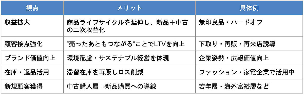 このように、リユースは単なる環境貢献だけではなく、買取を通じて顧客維持と新規開拓を同時にでき、収益拡大を実現する次世代型ビジネスとして再注目されている。