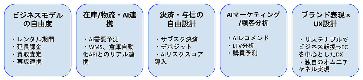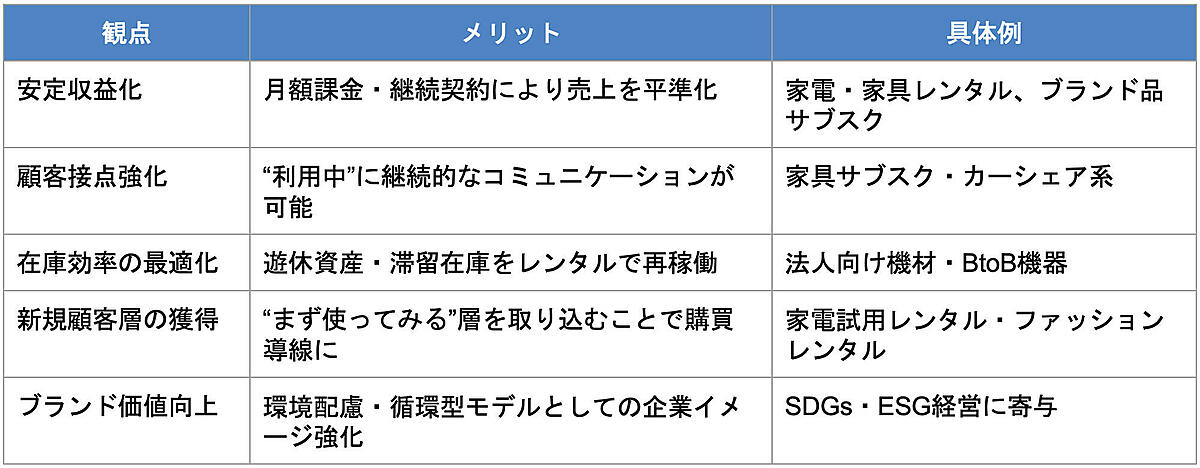このように、商品の「所有」ではなく「利用」に価値を見出した消費者向けのサービスに支持が集まっているレンタルビジネス。単に商品を貸すだけでなく、サブスクリプションなどを通じて顧客接点を継続的に持ち、ブランドロイヤリティを高める仕組みとして機能している。