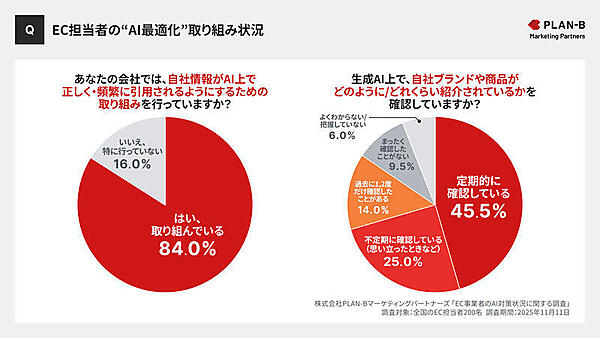 では、EC担当者は実際にどのくらい「LLMO(Large Language Model Optimization、大規模言語モデル最適化)」や「GEO(Generative Engine Optimization、生成エンジン最適化)」といった“AI時代への対応”を進めているのでしょうか。EC担当者200人を対象に実施したPLAN-Bの調査では、84%のEC担当者がすでにAI最適化に向けた取り組みを開始していることがわかりました。