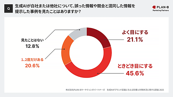 PLAN-Bの別の調査によると、6割以上のユーザーは、AIとの対話のなかで誤情報や競合混同を経験しており、 AIの出力内容が必ずしも正確ではないことが明らかになっています(参考:「【調査】7割が「AIが誤情報を伝えるリスク」を不安視―企業担当者180名に聞く、生成AIがブランド認知に与える影響と課題」)。