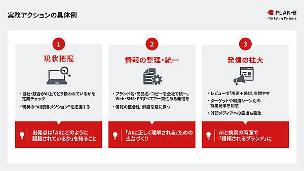 つまり、AIでどのように言及されるか“だけ”をめざすのではなく、ユーザーが検証する過程でも適切な自社情報に触れられるよう、Web全体で一貫した情報設計をし、正確な発信によって情報を広げておくことが重要です。