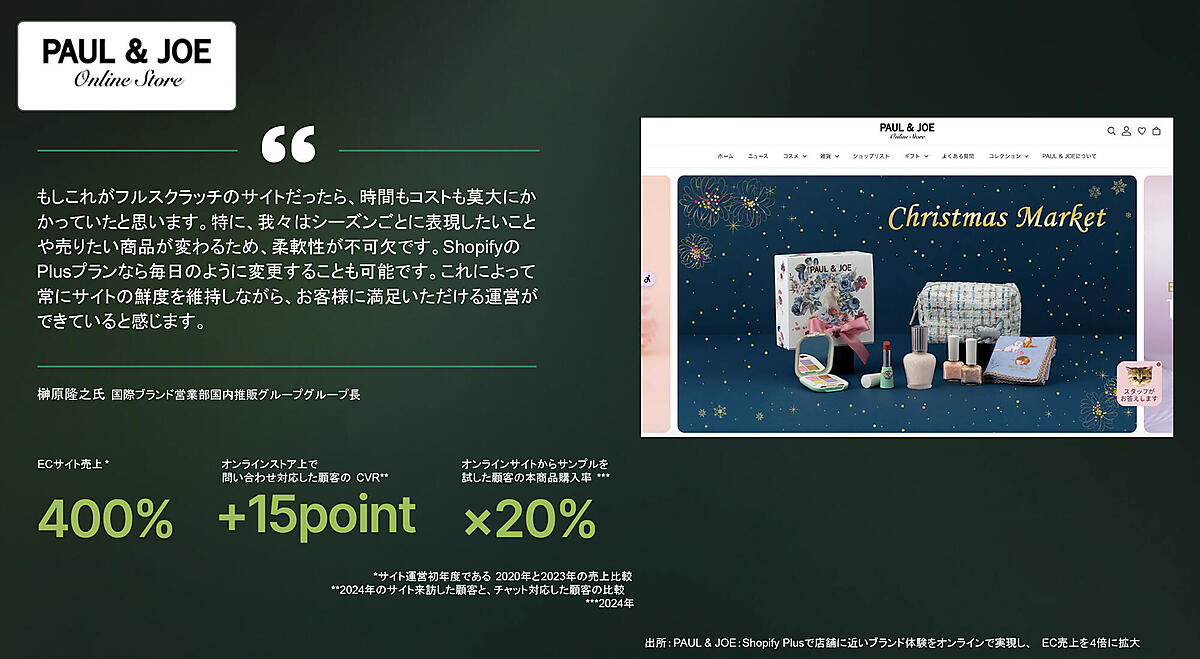 フランス発のファッションブランド「ポール&ジョー」を有するアルビオンも、フルスクラッチの膨大な時間とコストを避けるため、「Shopify」を採用した。同社ではシーズンごとに商品や表現が変化するため、施策を即座に実行できる迅速な土台が必要だった。結果としてEC売上400%増、CVR15%向上など大きな成果を上げている。