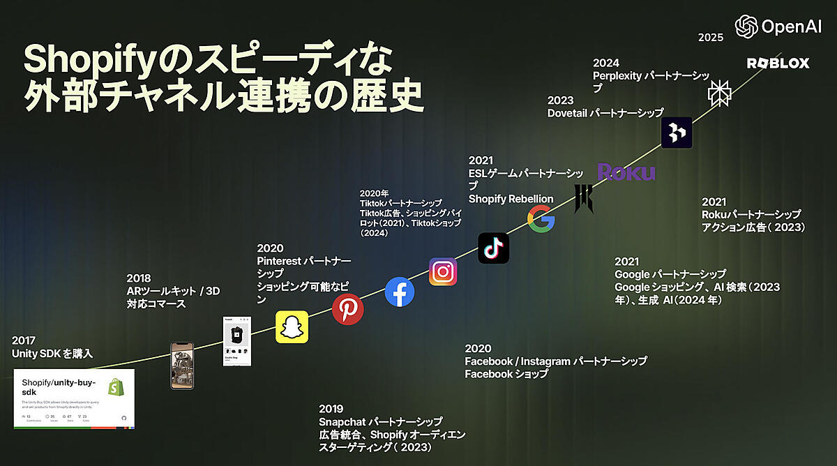 またShopifyは日本上陸以来、継続的にさまざまなプラットフォームとの連携を進めてきた。最も新しい連携先はOpenAIであり、米国ではすでに「ChatGPT」上での買い物が可能となっている。