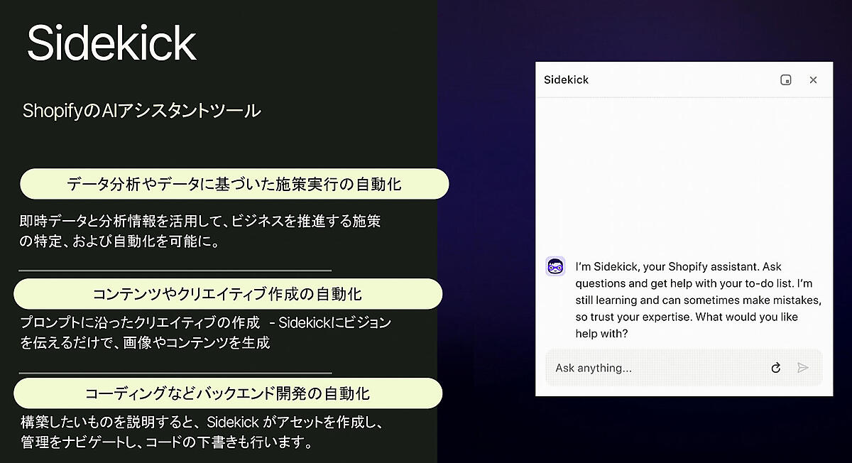 「Shopify」の数あるAIソリューションのなかでも、純正AIアシスタントツール「Sidekick(サイドキック)」は、管理画面に常に組み込まれており、日本語にも対応している。「Sidekick」はストアのデータをすべて学習しており、ストアに極めて詳しいAIとして常に利用する事業者の隣で伴走しているイメージだ。