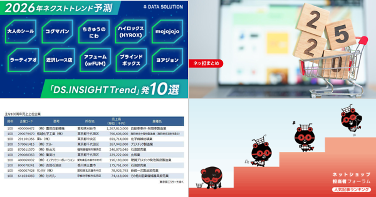 2026年にヒットが期待される10のキーワードは「大人のシール」「コグマパン」「ちきゅうのにわ」など/2025年のECを取り巻く環境はどう変わった?【ネッ担アクセスランキング】2026年1月2日~2026年1月8日にアクセス数の多かった記事のランキングを発表! 見逃している人気記事はありませんか?藤田遥1月9日 8:00シェアポストはてブBluesky 【ヤフートレンド予測2026】期待されるキーワード10点「大人のシール」「コグマパン」「ちきゅうのにわ」「ハイロックス」など 2026年にヒットが期待される10のキーワードは、「大人のシール」「コグマパン」「ちきゅうのにわ」「ハイロックス(HYROX)」「mojojojo」「ラーティアオ」「近沢レース店」「アフューム(arFUM)」「ブラインドボックス」「ヨアジョン」。鳥栖 剛[執筆]1月5日 6:00 EC化率の推移、広告表現、AI活用――2025年のECを取り巻く環境はどう変わった?【ネッ担まとめ】 ネットショップ担当者が読んでおくべき2025年12月1日~1月4日のニュース中林慎太郎[執筆]1月6日 8:0052業界動向解説・ノウハウ 2026年に100周年を迎える企業は3154社。創業100年超企業は4.9万社、EC販売にも注力する「京都利休園」は400周年 2026年に100周年を迎える企業で売上高トップは、トヨタグループの源流である豊田自動織機だ。そのほか、信越化学工業、東レ、クラレ、新出光、集英社、イノアックコーポレーションなどが名を連ねる。鳥栖 剛[執筆]1月5日 9:00 楽天・三木谷社長「誰でも簡単に便利にAIを活用できるようにする『AIの民主化』」で業務・マーケティング、オペレーションの効率向上に挑戦【年頭挨拶】鳥栖 剛[執筆]1月7日 8:30 【変革する決済の2026年予測】エージェントコマースの台頭、ステーブルコインの進展、消えゆく手動入力によるゲストチェックアウトなど Visaが2026年の決済分野に関する予測を公表。AIエージェントが「買い物代行」するエージェンティックコマースの本格化、ステーブルコインがグローバル決済インフラとして躍進 カード番号の手動入力の激減などをあげている。鳥栖 剛[執筆]1月6日 8:30 【生活者にきいた2026年】景気予想「悪くなる」は45.2%、お金をかけたいもの1位「ふだんの食事」、2位は「旅行」、3位は「貯金」 調査は2015年から毎年秋に実施。毎回、全国11都市圏に住む20~69歳の男女3900人に、翌年の景況感やお金の使い方などを聞いている。鳥栖 剛[執筆]1月5日 7:30 「エヴァンゲリオンストア」の海外戦略。熱狂的な海外ファンを惹き付ける施策とは?1月5日 8:00集客売上向上運営オムニチャネル事例・インタビュー 3-Dセキュア導入義務化後も不正被害は横ばい。「決済手数料値上げ」要請を受けた事業者が急増【不正被害・対策の実態調査2025】 かっこは2025年12月24日、EC事業者の不正被害や対策状況をまとめた「EC事業者実態調査2025」の結果を公表した。鳥栖 剛[執筆]1月6日 9:30 ペット商品卸大手エコートレーディングの子会社ペッツバリュー、「課題解決型」のペット商品EC「PETPET online」を開設 飼い主の悩みや要望に応じて商品候補がピックアップされるページ構成としている点が特長。ECサイトを通じ、グループ全体のデジタルシフトを加速する方針としている大嶋 喜子[執筆]1月5日 7:00 AIにオススメされた商品を購入した割合は26%、AIに「理由まで教えてもらった上で購入するようになった」は49%鳥栖 剛[執筆]1月7日 8:30※期間内のPV数によるランキングです。一部のまとめ記事や殿堂入り記事はランキング集計から除外されています。この記事をシェアしてほしいタヌ!ポストする>ブクマするnoteで書くLINEで送る