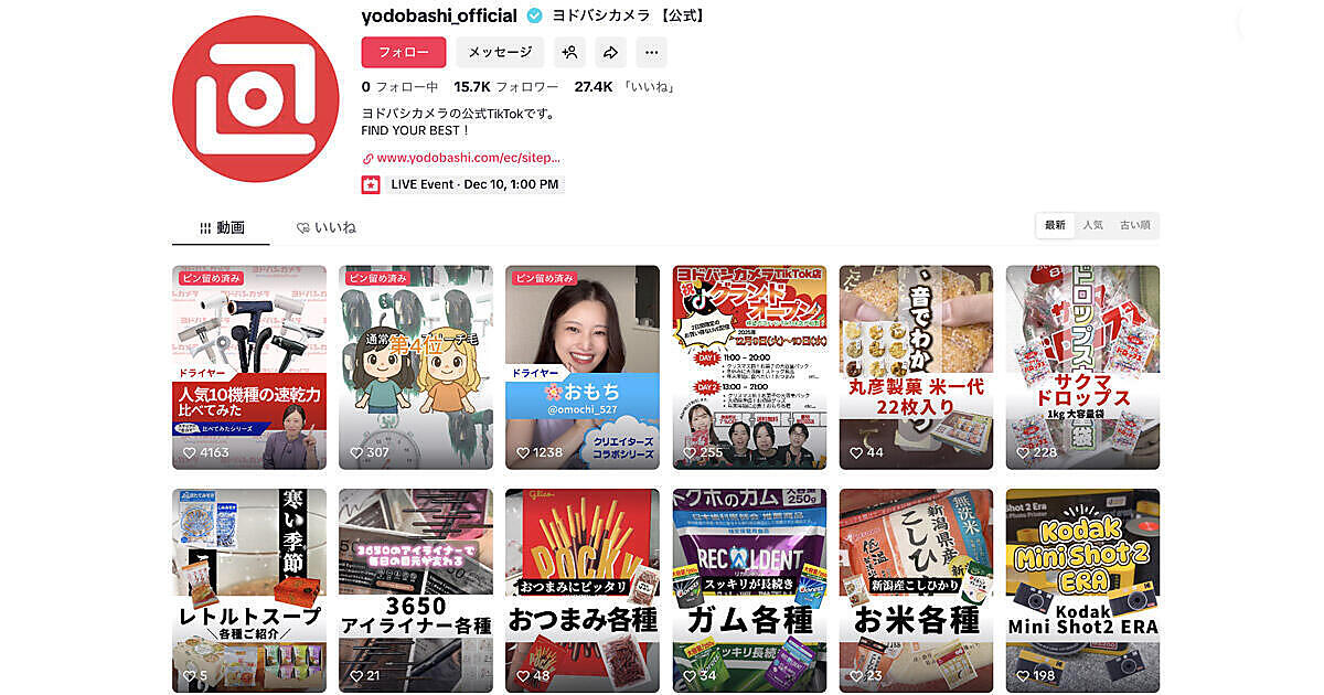 「TikTok Shop」の開設から約1か月、ヨドバシカメラのTikTokアカウントには1万6000人のフォロワーが付いている。動画コンテンツには、ドライヤーや電動歯ブラシ製品の機能比較から食品の紹介まで多様なコンテンツが並ぶ。