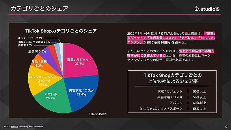 日本市場はまだ未成熟だが、ローンチ後1年(2025年7月~2026年6月)の流通総額は約500億円と予測されている。現状、売り上げの80%以上を「家電・ガジェット(23.7%)」「美容家電・コスメ(22.4%)」「アパレル(20.2%)」 の3カテゴリーが占めているという(いずれもstudio15調べ)。