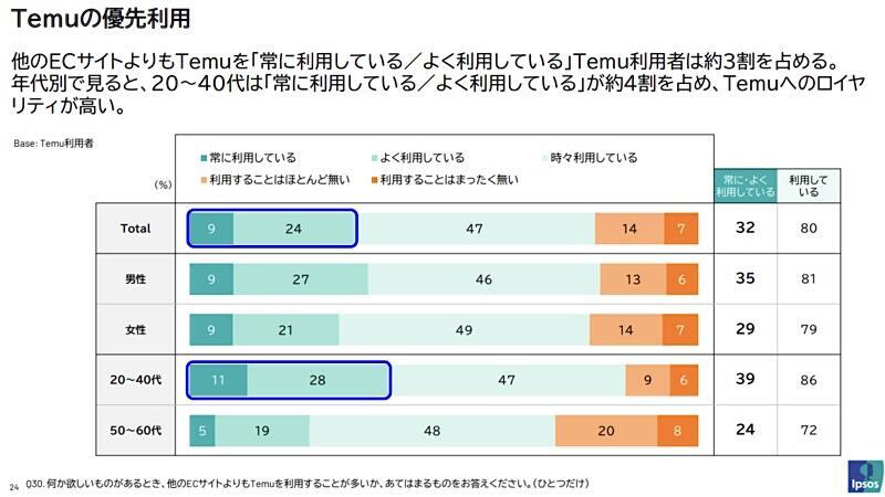 イプソスが国内20~69歳の男女を対象に実施した調査(2025年8月に公表)によると、約3割の「Temu」ユーザーが「他のECサイトよりも常に利用している」または「よく利用している」と回答している。