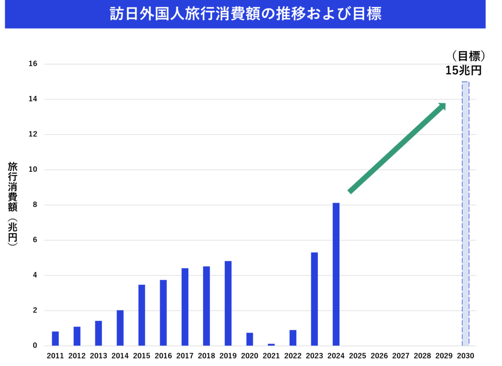 インバウンド消費は、GDP統計(国民経済計算)のなかで「サービス輸出」に分類され、「非居住者家計の国内での直接購入」として計上される。2019年の消費額は4.6兆円、2024年は同8.1兆円となり、年々増加。政府が主催する観光立国推進閣僚会議は、2030年に訪日客数6000万人、旅行消費額15兆円の目標を掲げている。