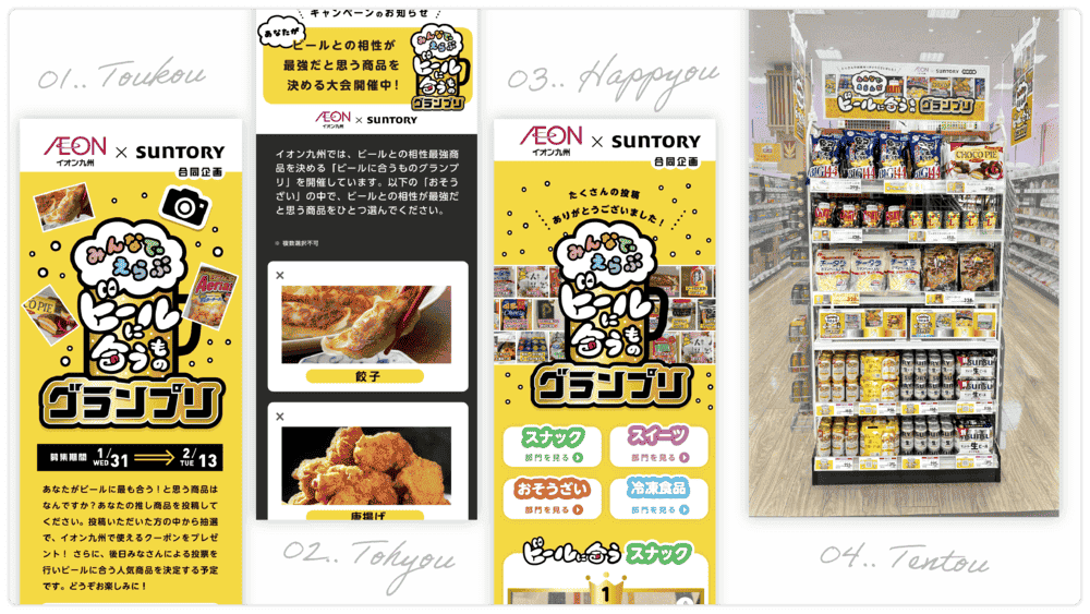たとえば、2024年3月にサントリーさんと連携し九州の店舗で実施した取り組みでは、単にビールのCMを流すのではなく、UGC(SNSなどに一般ユーザーが自発的に作成・投稿するコンテンツ。レビュー、口コミなど)を基に「このビールに合うおつまみランキング」という動画を作成し、サイネージで放映しました。さらに、そのランキングと連動した棚を作ったところ、多くのお客さまが足を止め、関心を示してくださったんです。これは、企業からの一方的なメッセージではなく、生活者のリアルな声が共感を呼んだ好例だと考えています。
