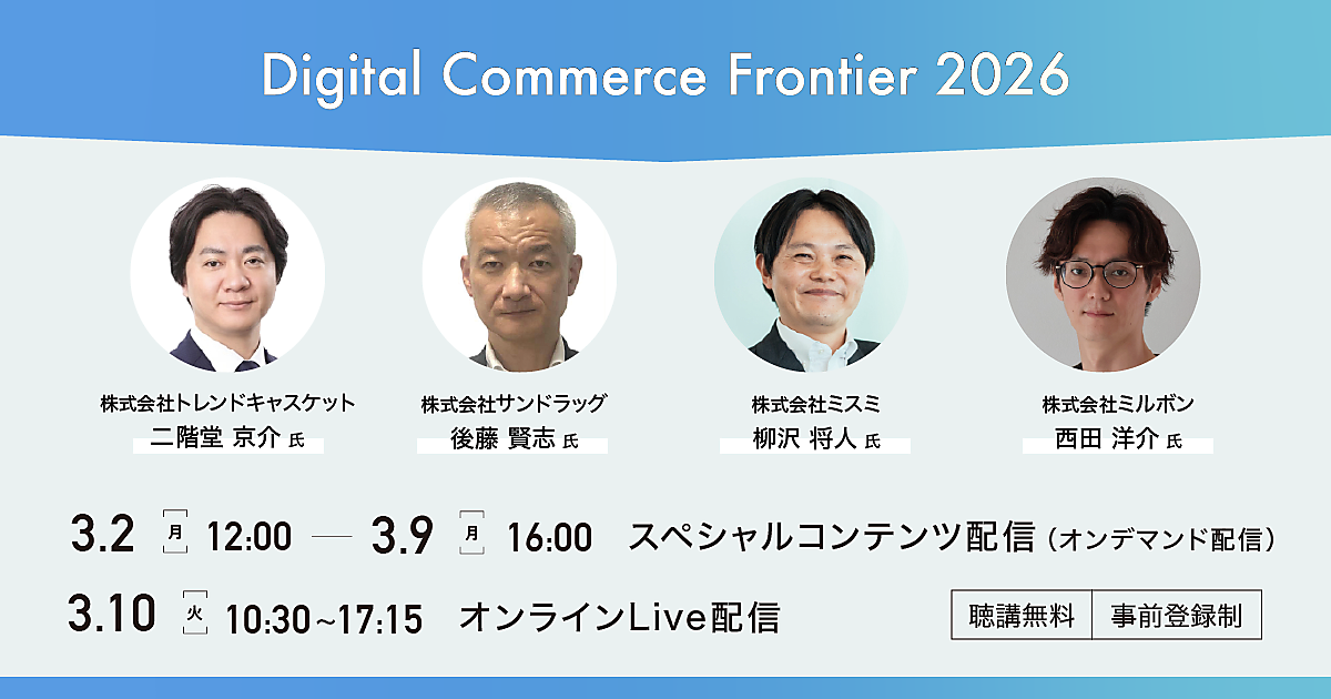 3月10日(火)にオンラインイベント「Digital Commerce Frontier 2026」を開催します。イベントに先駆け、3月2日(月)~3月9日(月)にはスペシャルコンテンツのオンデマンド配信を実施。ヨドバシカメラ、サンドラッグ、ミスミ、ミルボンなど著名企業の実践的事例や最新戦略を学べるセミナーを多数ご用意しています。視聴は無料です(事前登録制)。まだお申し込みをしていない人のために、編集部おすすめのスペシャルコンテンツの見どころをご紹介します。