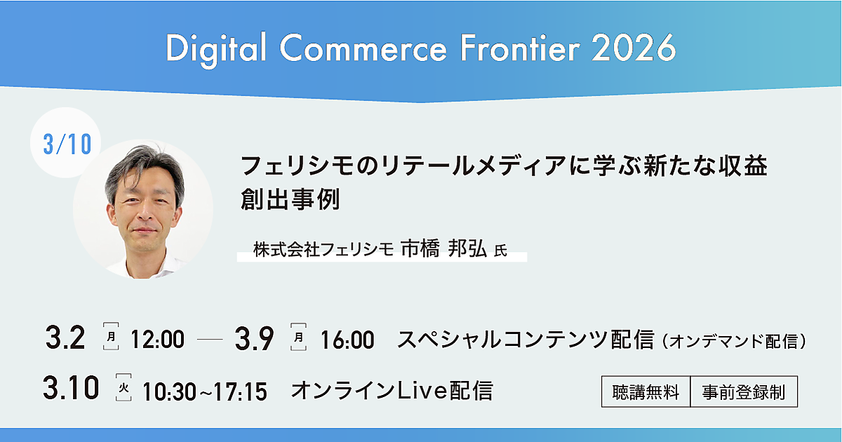 3月10日(火)にオンラインイベント「Digital Commerce Frontier 2026」を開催します。イベントに先駆け、3月9日(月)16時00分までスペシャルコンテンツをオンデマンドで配信中。ヨドバシカメラ、サンドラッグ、フェリシモ、日本アクセス、中川政七商店、TENTIALなど著名企業の実践的事例や最新戦略を学べるセミナーを多数ご用意しています。視聴は無料です(事前登録制)。まだお申し込みをしていない人のために、編集部おすすめのスペシャルコンテンツの見どころをご紹介します。