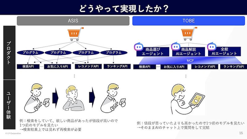 「Yahoo!ショッピング」には多数のAPIが存在するが、従来はコードで定義した範囲内でしか活用できなかった。今後はAIエージェントがユーザーの要望に応じて適切なAPIを組み合わせ、最適な形で出力する世界観をめざす。利用は任意で、従来の買い物体験にいつでも戻れる設計とした。