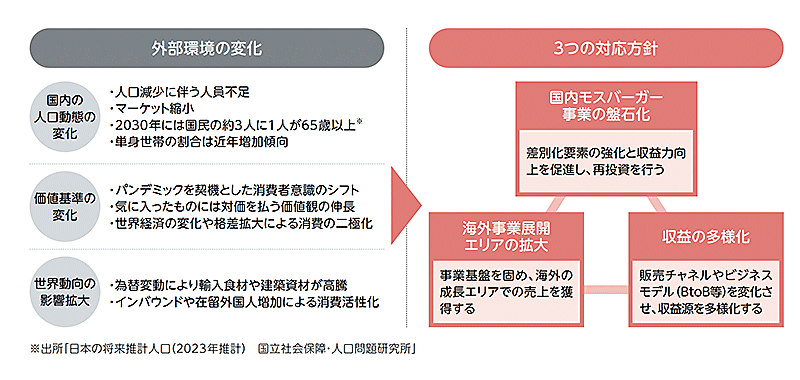 モスフードサービスは、2025年9月に発行した「MOS REPORT(モスグループ統合報告2025)」で、中期経営計画における3つの対応方針として、「国内モスバーガー事業の盤石化」「海外事業展開エリアの拡大」「収益の多様化」を掲げた。