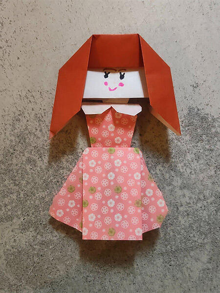 そして、さらに進化したものとして、ドレスというのもあります。けっこう細かく折っていき何とか完成。別で作った顔部分をくっつけると女の子のできあがりです。顔部分はペンで細部を描くのですが、そこは娘の担当です。
