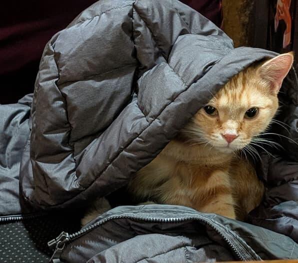 今月のお猫さまは、ダウンジャケットに潜り込んでいる茶柱さん。中でバリバリ音を立てないで~~~~
