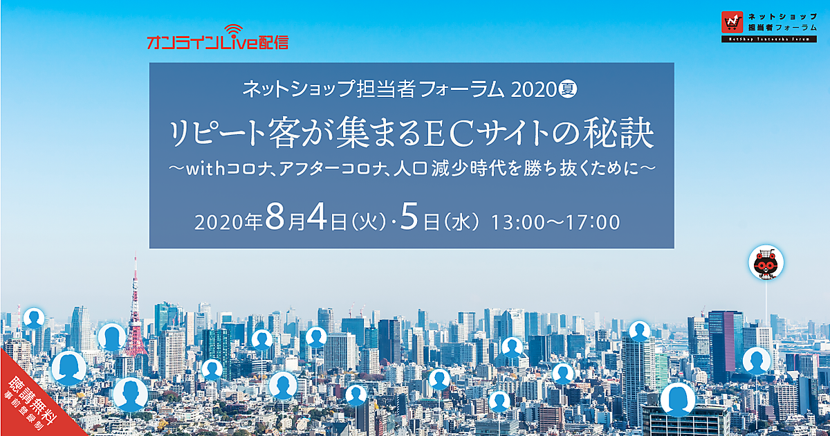 | イベント名 | ネットショップ担当者フォーラム 2020 夏 リピート客が集まるECサイトの秘訣〜withコロナ、アフターコロナ、人口減少時代を勝ち抜くために〜 |