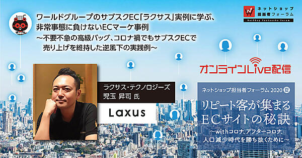 | イベント名 | ネットショップ担当者フォーラム 2020 夏 リピート客が集まるECサイトの秘訣〜withコロナ、アフターコロナ、人口減少時代を勝ち抜くために〜 |