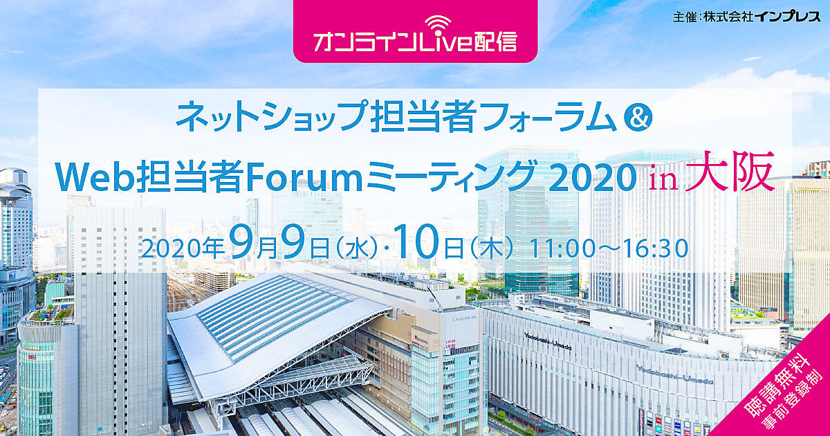 ネットショップ担当者フォーラム、Web担当者Forumでは、地域におけるeコマース市場の現状と課題を把握し、その方策を導くため、「ネットショップ担当者フォーラム/Web担当者Forumミーティング2020 in 大阪」をオンラインLIVE配信にて開催いたします。