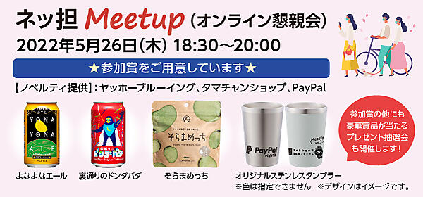 | 18:30 | 先着100名オンライン懇親会 ネッ担 Meetup Vol.1 (オンライン懇親会) 先着100名様 ★参加賞、プレゼント抽選会をご用意しています★ 【ノベルティ提供】:ヤッホーブルーイング、タマチャンショップ、PayPal ネッ担Meetup は、ネットショップ担当者フォーラム 2022 春にご参画いただいた講師・外部招聘ゲスト、視聴者、スポンサー企業を集い、参加者同士が立ち話感覚で、eコマースに関する様々な情報交換ができるオンライン懇親会の場です。