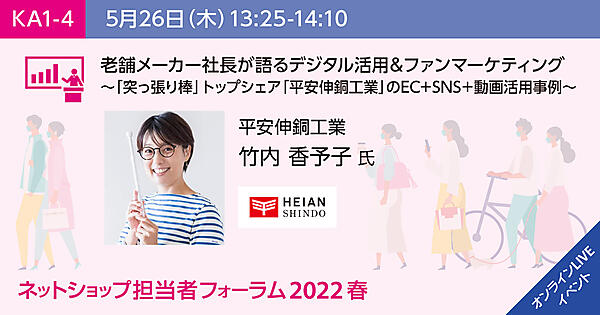 | 13:25 | KA1-4ゼネラルセッション 老舗メーカー社長が語るデジタル活用&ファンマーケティング ~「突っ張り棒」トップシェア「平安伸銅工業」のEC+SNS+動画活用事例~ ![]() 講師