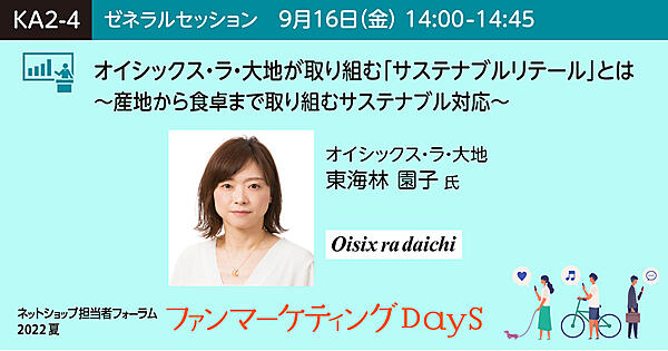 | 14:00 | KA2-4ゼネラルセッション オイシックス・ラ・大地が取り組む「サステナブルリテール」とは ~産地から食卓まで取り組むサステナブル対応~ ![]() 講師