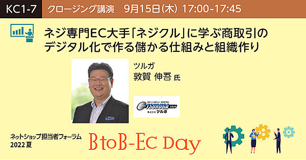 セッション概要 中小企業IT経営力大賞(経済産業省)で「審査委員会奨励賞」、関西IT活用企業百選で「最優秀企業」を受賞し、ネジ専門のBtoB-ECサイト「ネジクル」を運営するツルガ。紙の卸からメール活用、そしてECサイトを開設したのは2008年。同時にCRMにも取り組み、早くからBtoB商取引のデジタル化を進めてきました。「今日頼んで明日には届くこと」「価格の透明性」「豊富な情報量」による競合との差別化、積極的なIT活用で業務効率化を実現しています。その取り組みについて、ツルガ代表取締役社長の敦賀伸吾氏が解説します。 プロフィール 1973年兵庫県生まれ 参加対象者 時流に対応したビジネスモデルに興味のある方 受講するメリット ビジネスの規模にかかわらず、戦略設計図は必要です。弊社の事例資料を参考に頭の中を整理整頓しながらご自身の会社に活用していただければありがたいです。 こんなニーズや悩みにこたえられる内容です 既存のビジネスモデルから時流に対応したビジネスモデルに変革してゆくことは試行錯誤の連続です。 続きを読む | |