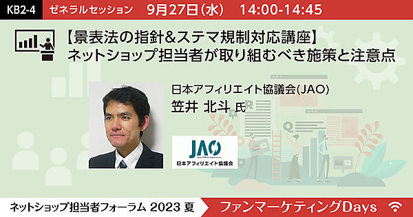 令和4年6月に景品表示法「事業者が講ずべき景品類の提供及び表示の管理上の措置についての指針」にアフィリエイトが盛り込まれ、本年10月1日からは『一般消費者が事業者の表示であることを判別することが困難である表示』が告示指定されます(いわゆるステマ規制)。アフィリエイターやインフルエンサー、広告代理店等の第三者に広告・宣伝してもらう際、ネットショップ担当者が取り組むべき施策や注意すべき点について解説します。