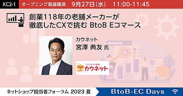 | 11:00 | KC2-1 オープニング基調講演 創業118年の老舗メーカーが 徹底したCXで挑む BtoB Eコマース ![]() 講師