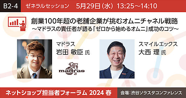 創業100年を超える革靴メーカーのマドラスは、メインの販売チャネルである実店舗だけでなく、ECとのオムニチャネル化を進めています。講演では、社内改革の旗振り役となり、売り上げや会員数アップの成果をあげてきた取締役 本部長の岩田敏臣氏が登壇。失敗を糧に実現したしたブランド公式サイト、コーポレートサイト、ECサイトの統合、組織作り、実店舗連携など、オムニチャネル推進の裏側を解説します。