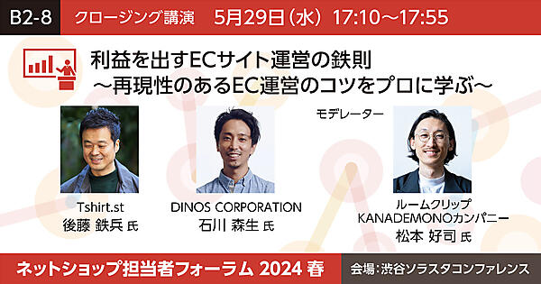 送料の値上げ、原価高騰、プレイヤーの増加など、ECビジネスを取り巻く環境は厳しさを増しています。こうした環境下で成長し、生き残るためには、「売り上げを伸ばす」「利益を出す」ための再現性ある施策、ECサイト運営が重要になります。年間200万枚以上の無地Tシャツを売る「Tshirt.st」の後藤氏は、キャンセルやバックヤード業務の効率化、梱包の適正化などにより、競争激しいTシャツジャンルで成長をけん引。石川氏は“成長請負人”としてさまざまな企業のECビジネスに携わってきた経験から、“効果が出る施策”などのノウハウがあります。そんな両者が、自身の経験を踏まえた「再現性のある」施策や運営のコツなどを解説します。