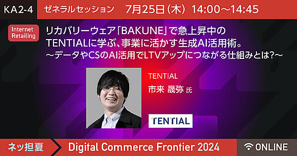 「Digital Commerce Frontier 2024」は、リテールビジネス、BtoC-EC、BtoB-EC、メーカーECなどデジタルコマースに携わる経営者・責任者・担当者に対し、AIやリテールテックなどの最新トレンド、最先端テクノロジー活用、事例、最新ソリューションなどをお届けするイベントです。