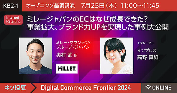 フランス発祥の本格登山ブランド「ミレー(MILLET)」で広く知られ、アウトドアファンを中心に人気を集めているミレー・マウンテン・グループ。その日本法人は近年直販チャネル強化のため、さまざまな施策を通じてEC事業を拡大させています。講演では、マネジメントから現場の業務まで広く担う、イーコマース・マネージャーの奥村氏が登壇。これまでのEC事業の取り組み、社内体制、ツールを活用した業容拡大のノウハウまで深掘りし、自社の事例をベースにECの知見を解説します。