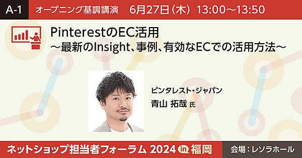 | 13:00 | A-1オープニング基調講演 PinterestのEC活用 ~最新のInsight、事例、有効なECでの活用方法~ ![]() 講師