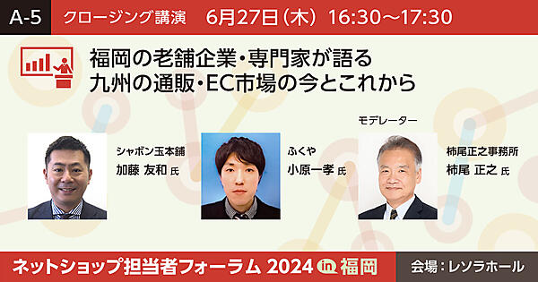 デジタル化の波、D2C企業の増加、規制強化など通販・ECを巡る市場環境の変化に、“通販王国”と呼ばれる九州の企業は、現在の市場をどのように捉え、今後の市場環境をどのように見据えているのでしょうか? 通販実施企業として老舗と言われる「ふくや」「シャボン玉石けん」の責任者が登壇。元JADMA(公益社団法人通信販売協会)の柿尾氏をモデレーターに迎え、現在の市場感、そして九州企業として今後の挑戦などについてディスカッションします。