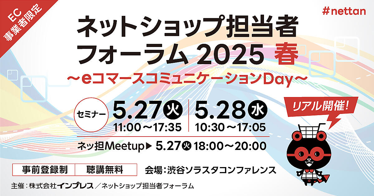 | 開催時期 | セミナー :2025年5月27日(火)11:00~17:35(受付開始10:30) :2025年5月28日(水)10:30~17:05(受付開始10:00) ネッ担 Meetup(懇親会) :2025年5月27日(火)18:00~20:00(受付開始17:45) |