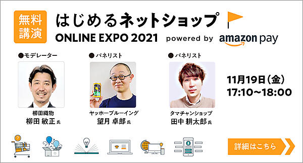 「業績を伸ばしたい」「売れるようになりたい」「新規客・リピーターを増やしたい」――。「はじめるネットショップ ONLINE EXPO 2021」の講演動画には、こうした事業者さまのニーズや課題を解決に導くためのヒントが盛りだくさん! EC業界を代表する事業者さまや、ECのプロ・専門家が集結し、自社の成功の秘訣などを語った15本の動画から、あなたのネットショップを伸ばす・成長させるヒントを見つけてください!
