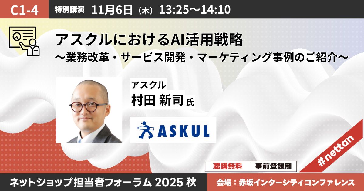 13:25 | C1-4 特別講演 アスクルにおけるAI活用戦略 〜業務改革・サービス開発・マーケティング事例のご紹介〜