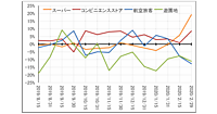 マクロで見た「業種別消費指数」のうち、「EC」は前年の2月後半と比べて4.6%増、「医薬品・化粧品小売」は同6.4%増。一方、「旅行」「娯楽」「宿泊」などは総じて同マイナスとなっている
