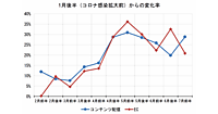 コロナ禍の消費動向で「EC」シフトが加速しており、前年5月前半との比較でECは21.1%増、1月後半との比較では33.5%増となっている