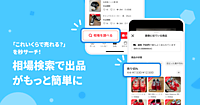 「相場検索」機能は、出品しようとしている商品を、画像またはキーワードで検索することで、販売の相場価格や最も利用されている配送料金をひと目で確認し、そのまま出品に進める機能。