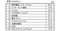 1位は「携帯電話・スマートフォン」、3位は「パソコン」。1位の「携帯電話・スマートフォン」、2位の「インターネット通販」、4位の「100円均一ショップ」については、男女すべての年代で10位以内に入った