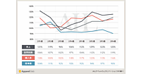 2017年3月末に比べて、2019年3月末で伸長している業種は、「サービス業種」「インテリア・寝具・家電業種」「アミューズメント業種」の順。業種別テナント数では、「サービス業種」「ファッション業種」「飲食業種」の順だった。 一方、2017年3月末と比べるとファッションやファッション雑貨は6~7%台の減少。同期間比のサービステナント数比較では、カルチャー教室・学校が11%台の伸びとなっている