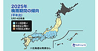 梅雨の期間は短い傾向で、中国・四国・近畿・東海・関東甲信で平年より1〜3日、九州南部・九州北部・北陸・東北南部・東北北部では4日以上短くなり、特に沖縄・奄美では10日以上短くなる予想としている。