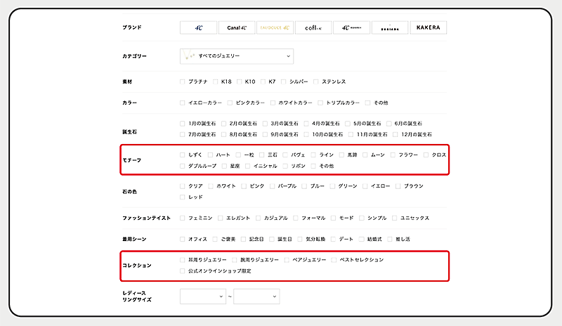 - 「コレクション」の絞り込み項目:「耳周りジュエリー」「ペアジュエリー」「公式オンラインショップ限定」