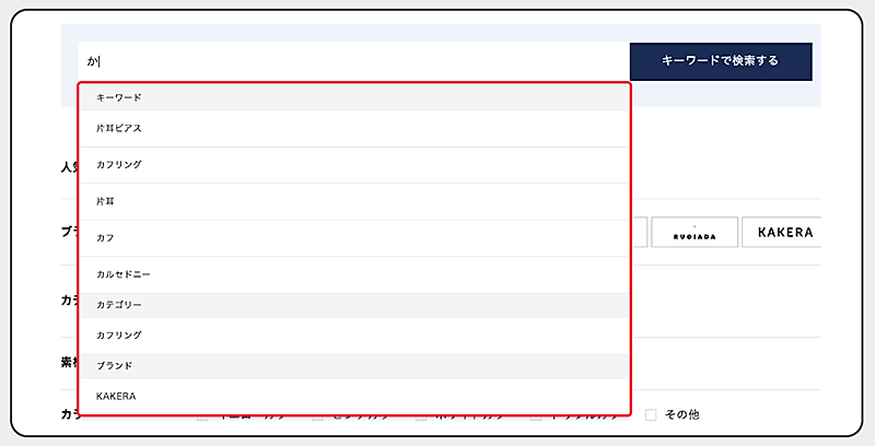 検索窓に入力中のテキストに基づく予測キーワード・カテゴリー・ブランドをサジェストとして表示するようにした。すべてのテキストを入力する前に目的の項目を選択できるようにすることで、ユーザーの手間を省き、利便性向上につなげる。
