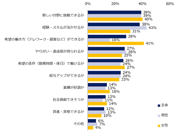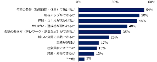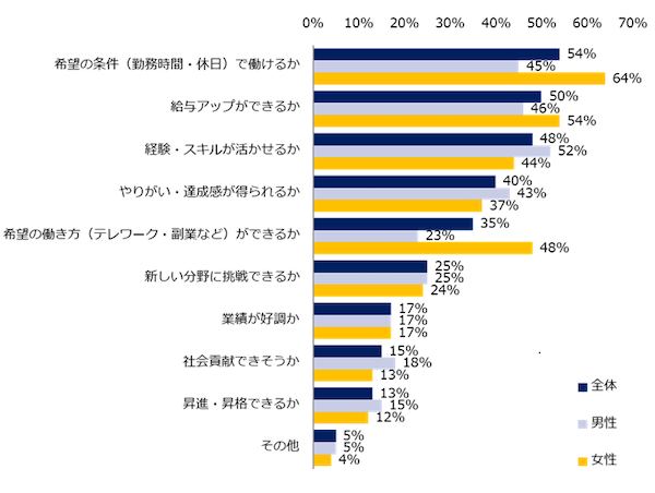 男女別の傾向では、男性は「経験・スキルが活かせるか」(52%)が最多。女性では「希望の条件(勤務時間・休日)で働けるか」(64%)が最多だった。