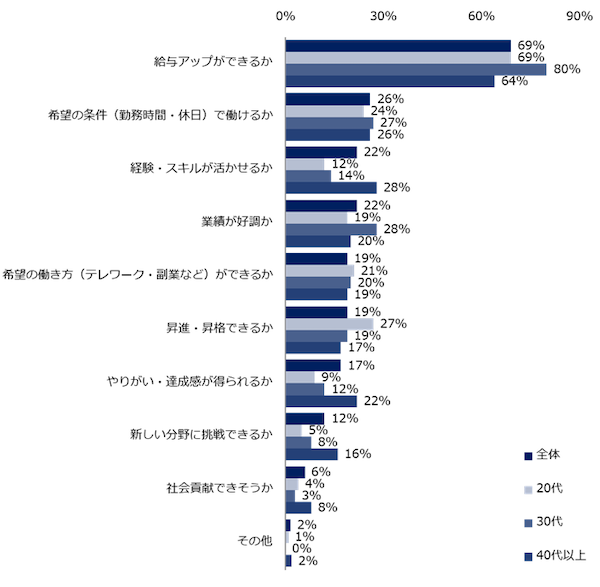 重視するポイントとして最も多かったのは「給与アップができるか」(69%)だった。特に30代では8割に達した(20代:69%、40代以上:64%)。