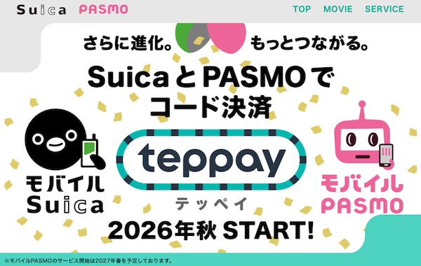 東日本旅客鉄道(JR東日本)とパスモは11月25日、交通系ICの「Suica」「PASMO」において、コード決済サービス「teppay(テッペイ)」を提供すると発表した。「Suica」は2026年秋、「PASMO」は2027年春から提供を開始する。